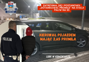 Kierujący pojazdem marki Toyota na drodze ekspresowej jechał „wężykiem” stwarzając realne zagrożenie. Swoją jazdę zakończył na MOP Sierakowo, gdzie zatrzymał się na parkingu przy stacji paliw. Z samochodu wyciągnął „dwusetkę” wódki i napój. Dalszą jazdę i spożywanie alkoholu uniemożliwili mu świadkowie i kościańscy policjanci. Badanie trzeźwości wykazało u mężczyzny aż 2,65 promila alkoholu w wydychanym powietrzu. Po wytrzeźwieniu usłyszy zarzuty, a o jego dalszym losie zadecyduje Sąd.