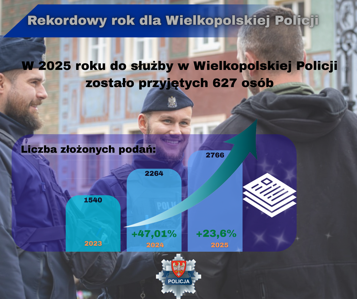 Rok 2025 był dla wielkopolskiej Policji czasem realnego wzmocnienia kadrowego. W ciągu całego roku przyjęliśmy do służby 627 nowych funkcjonariuszy, którzy zasilili jednostki w całym województwie. To znaczące wzmocnienie przekłada się bezpośrednio na poprawę bezpieczeństwa mieszkańców naszego regionu oraz sprawniejsze realizowania zadań ustawowych Policji.