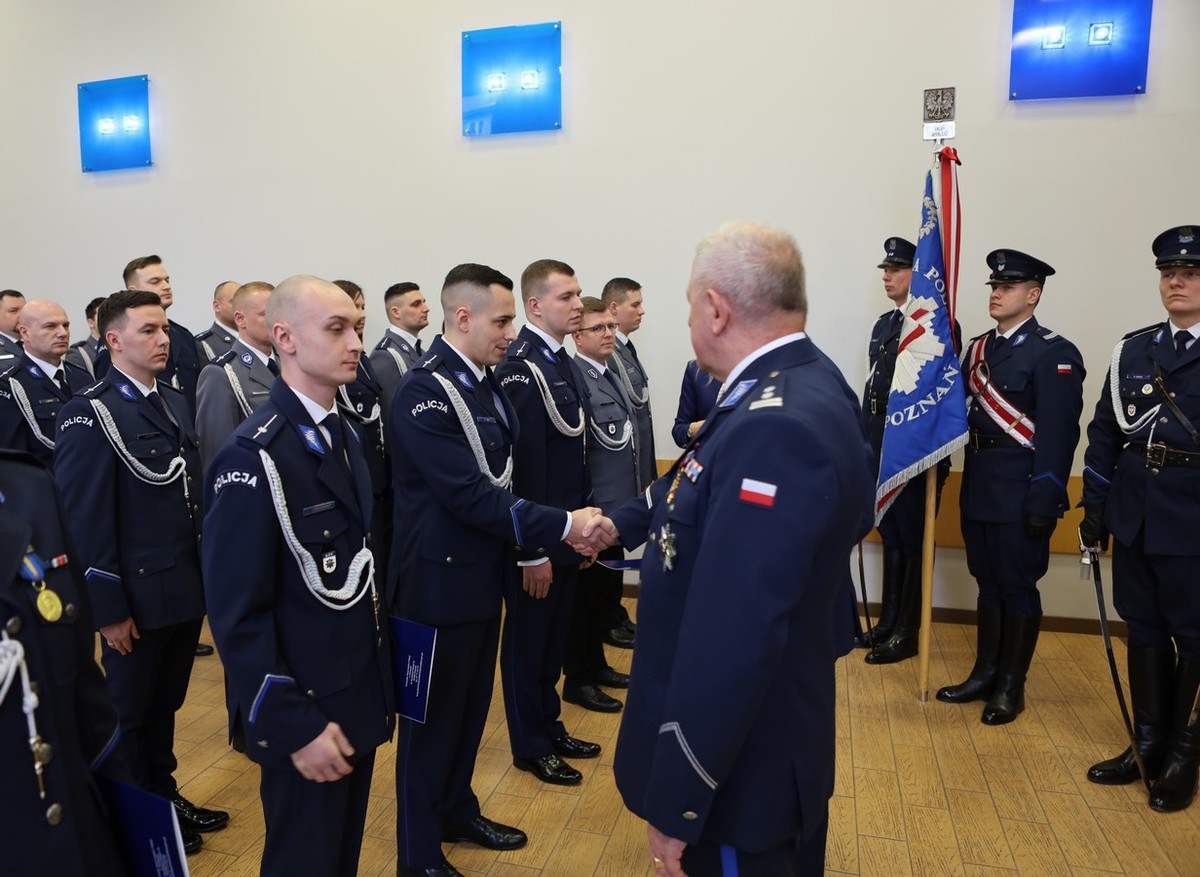 W imieniu Komendanta Wojewódzkiego Policji w Poznaniu nadinsp. Tomasza Olczyka, I Zastępca Komendanta Wojewódzkiego Policji w Poznaniu insp. Sławomir Piekut wręczył ponad 200 policjantkom i policjantom awanse na stopień młodszego aspiranta. Dzisiejsza uroczysta zbiórka to pokłosie odbytego szkolenia aspiranckiego i zdanego pomyślnie egzaminu końcowego. Pierwszy stopień w korpusie aspirantów i podoficerów to symbol zaufania, odpowiedzialności i kolejnego szczebla w policyjnej karierze. W uroczystości brał również udział Przewodniczący ZW NSZZ Policjantów woj. wielkopolskiego mł. insp. Andrzej Szary oraz przełożeni awansowanych funkcjonariuszy.