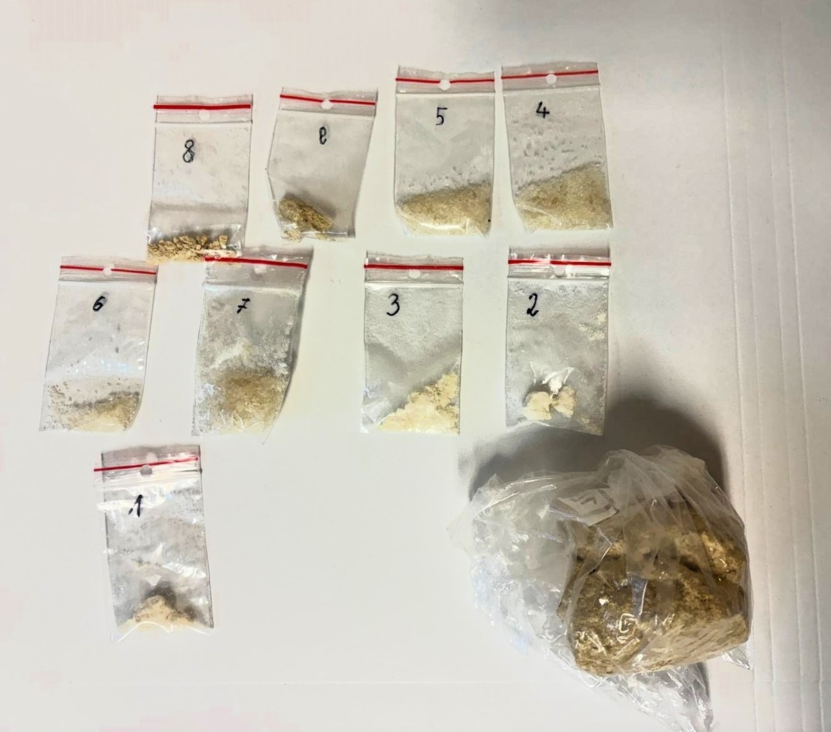 Podczas legitymowania Złotowianina jego nerwy i frustracja narastały, a mocne ściskanie szelek plecaka sugerowało, że wyjaśnienie takiego zachowania kryje się w jego wnętrzu. Podczas kontroli mundurowi w plecaku znaleźli kilka woreczków strunowych z zawartością białego proszku, woreczek ze zbryloną substancją oraz worek z tabletkami koloru zielonego i różowego.