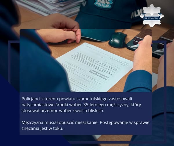 Policjanci z terenu powiatu szamotulskiego zastosowali natychmiastowe środki wobec 35-letniego mężczyzny, który stosował przemoc wobec swoich bliskich. W rodzinie wszczęto procedurę „Niebieskie Karty”. Postępowanie w sprawie znęcania nad rodziną jest w toku, a mężczyźnie grozić może kara więzienia.