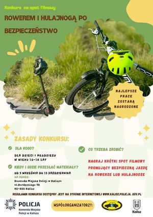 Komenda Miejska Policji w Kaliszu zaprasza do wzięcia udziału w konkursie „Rowerem i hulajnogą po bezpieczeństwo” organizowanego wspólnie z Urzędem Miasta Kalisza i Wojewódzkim Ośrodkiem Ruchu Drogowego w Kaliszu. Celem konkursu jest kształtowanie właściwych nawyków i zachowań dzieci i młodzieży na drodze podczas jazdy na rowerze i hulajnodze, a także uświadamianie o odpowiedzialności za bezpieczeństwo własne i innych uczestników ruchu drogowego